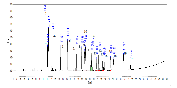 使用DB-5(30m×250μm×0.25μm)色谱柱,谱图如下: